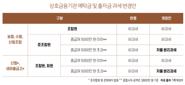 농어민 등 조합원이거나 소득수준이 서민형 ISA 가입 조건인 총급여 5000만 원(종합소득 금액 3800만 원)보다 낮은 준조합원은 이자소득세 비과세를 계속 적용하지만, 소득수준이 기준보다 높은 준조합원은 저율 분리과세(2026년부터 5%, 2027년부터 9%)를 적용한다. 적용 대상은 2026년 1월 1일 이후 가입 및 출자분부터다.