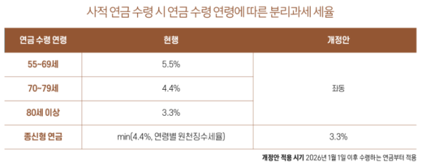 IRP나 연금저축에 납입하면서 세액공제를 받은 금액이나 거기서 발생한 운용수익, 그리고 연금계좌로 이체한 퇴직금이나 이체한 퇴직금에서 발생한 운용수익에 대해서는 연금소득세를 과세한다. 연금계좌에서 수령하는 연금의 원천에 따라 세율은 다르다. 세액공제를 받은 금액과 연금계좌에서 발생한 운용수익에 대해서는 연간 1500만 원 이하를 연금으로 인출할 때 연금 수령 연령에 따라 3.3~5.5%(지방소득세 포함)의 연금소득세를 과세하는데, 종신형 연금은 4.4%와 연금 수령 연령에 따라 적용되는 세율 중 적은 세율을 적용해왔다. 이번 세법 개정안에서는 2026년 1월 1일 이후의 종신형 연금은 연금 수령 연령에 관계없이 3.3%의 연금소득세를 적용하기로 했다.