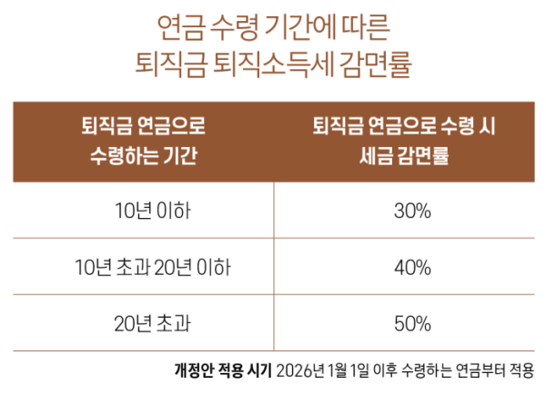 연금계좌로 이체한 퇴직금을 55세 이후 연금으로 인출할 경우 일시금 등 ‘연금 외 수령’했을 때보다 퇴직소득세를 감면해준다. 감면률은 퇴직금을 연금으로 수령하는 기간에 따라 다르다. 연금 수령 기간이 10년 이하인 경우에는 30%, 10년을 초과한 경우에는 40%였다. 하지만 이번 세법 개정을 통해 연금 수령 기간 20년을 초과할 때 감면률 50% 구간을 신설하기로 했다.