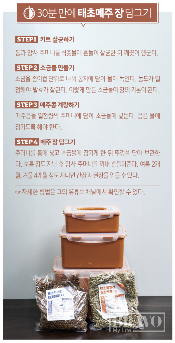 “식탁 위 간장·된장만 바뀌어도 건강해진다”는 이계호 교수는 누구나 손쉽게 실천할 수 있는 방법을 고민했다. 그 결과 개발한 것이 ‘태초메주’다. 준비 과정은 간단하다. 김치통에 소금과 태초메주를 넣기만 하면 된다. 불과 30분이면 담그기가 끝나고, 여름에는 2개월, 겨울에는 4개월 뒤 직접 만든 간장과 된장을 맛볼 수 있다.