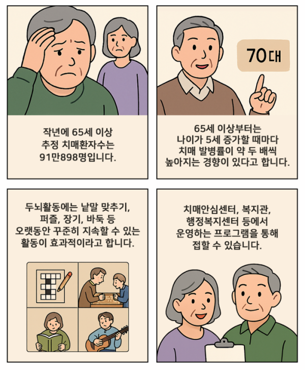 중앙치매센터는 그러면서 두뇌 운동에 좋은 활동 10가지로 △낱말 맞추기 △퍼즐 △장기 △바둑 △카드놀이 △글 읽고 쓰기 △가족이나 친구들과의 대화 △컴퓨터 사용 △음악 듣기 △그림 그리기 △문화생활 참여 등을 안내했습니다.