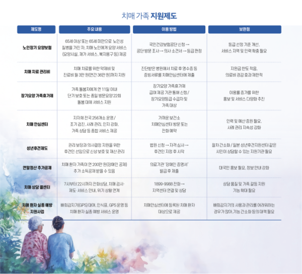 우리 나라는 2024년 말 초고령사회에 진입했다. 보건복지부에 따르면 2024년 기준 국내 치매 환자는 약 97만 명으로 65세 이상 노인 10명 중 1명꼴이다. 치매 환자의 80% 이상이 가정에서 가족 돌봄에 의존하고 있으며, 이 과정에서 배우자나 자녀 등 보호자는 극심한 육체적·정신적 소진을 겪는다. 정부는 노인장기요양보험, 장기요양 가족휴가제, 중증치매 산정특례, 치매정책사업(치매 치료관리비 지원, 조호물품 제공, 치매 가족 및 보호자 지원사업, 실종 예방 지원사업 등), 성년후견제도, 치매가족 연말정산 인적공제, 치매상담콜센터 등 다양한 지원책을 내놓았다. 하지만 막상 어떤 제도를 어떻게 이용해야 하는지 몰라 방황하는 것이 현실이다. 제도에 대한 접근성과 안내 체계의 발전이 필요한 시점이다.