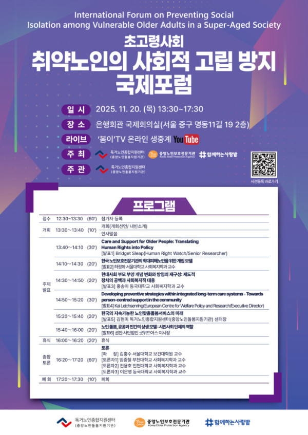 주최 측은 “2025년 한국은 초고령사회에 진입하지만 여전히 노인 빈곤율과 자살률은 OECD 최고 수준”이라며 “노년기의 존엄한 삶을 지키는 것이 사회적 과제가 된 지금, 취약노인의 인권 보호와 돌봄 강화를 통해 사회적 고립을 막고 연대를 촉진하자는 취지에서 포럼을 준비했다”고 밝혔다.