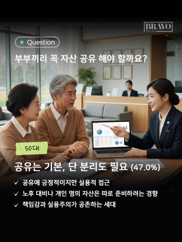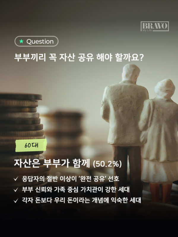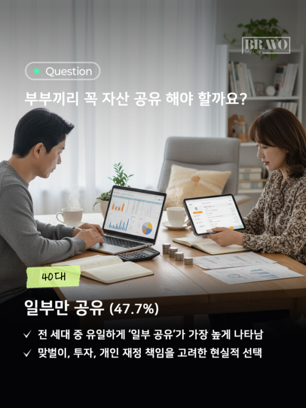 부부가 재산을 함께 관리해야 하는가에 대한 논쟁은 세대에 따라 뚜렷하게 갈린다. 카카오페이 페이로운 소식 설문(2024.04)에 따르면, 젊은 세대일수록 자산을 공동으로 관리하는 데 익숙한 반면, 연령대가 높아질수록 일부 분리 관리나 개인 재정권을 중시하는 경향이 나타났다. 흥미로운 점은 20·30대는 ‘공유가 기본’이라는 태도가 강하지만, 40대부터는 실용적 이유로 ‘부분 공유’에 무게가 실리고, 50대는 공유를 원칙으로 하되 필요하면 분리도 허용하는 태도를 보인다. 반면 60대는 절반 이상이 여전히 “부부 재산은 함께”라는 인식을 유지하고 있었다.
