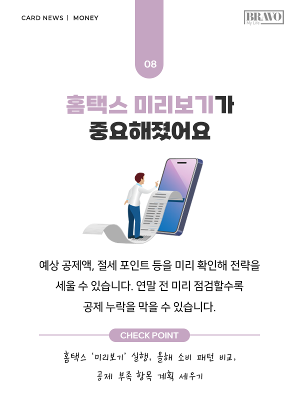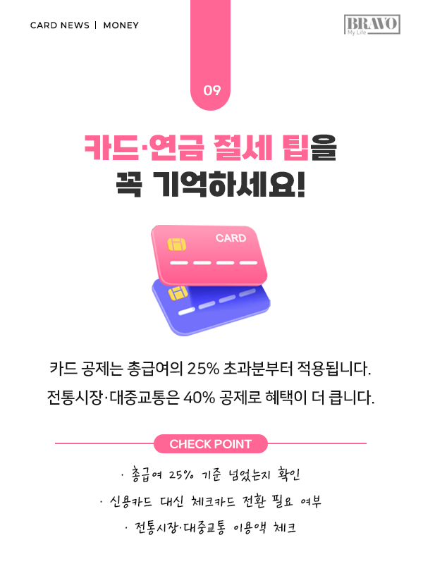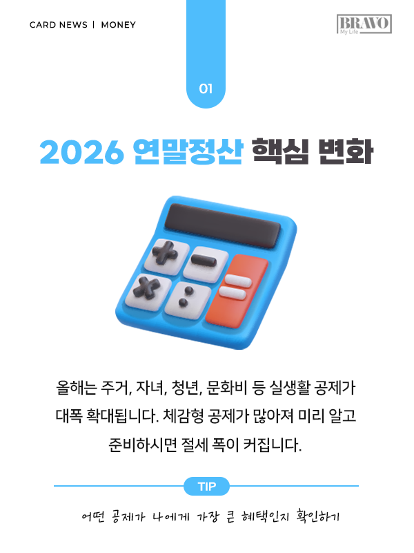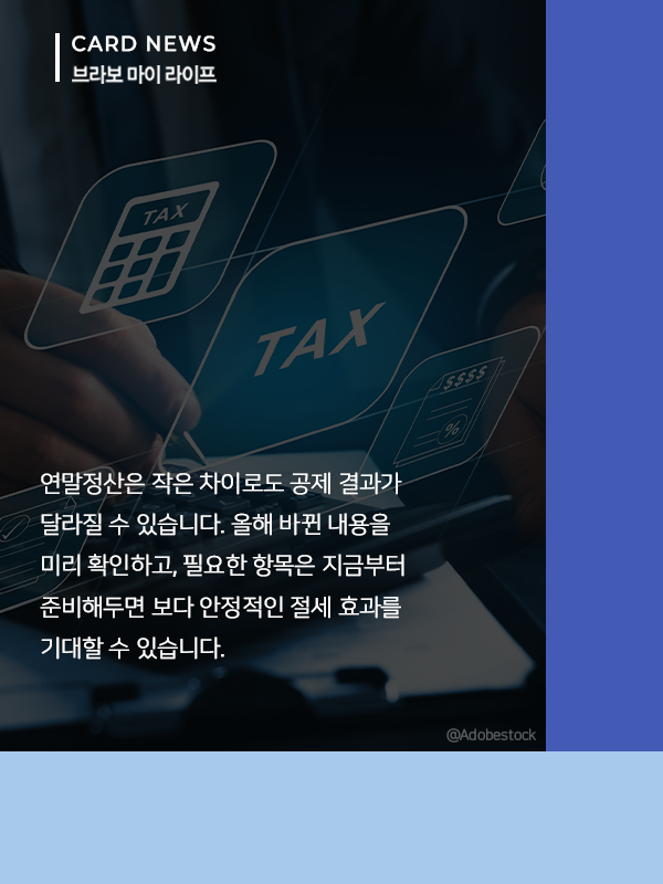 연말정산은 연초가 아니라 연말 두 달이 실질적인 승부처가 된다. 의료비·기부금·연금저축 등 주요 공제 항목을 점검하고 필요한 소비나 추가 납입 시기를 조정하면 절세 효과를 극대화할 수 있다. 올해 달라진 주요 공제 변화와 체크포인트는 카드뉴스에서 상세히 확인할 수 있다.