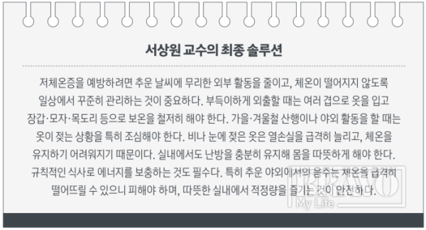 서상원 대전을지대학교병원 응급의학과 교수는 “저체온증은 의학적으로 한랭 손상에 해당하는 질환이다”면서 “추위 노출이 직접 원인이 되는 1차 저체온증과, 체온조절 기능이 손상돼 생기는 2차 저체온증으로 구분한다”고 설명했다.