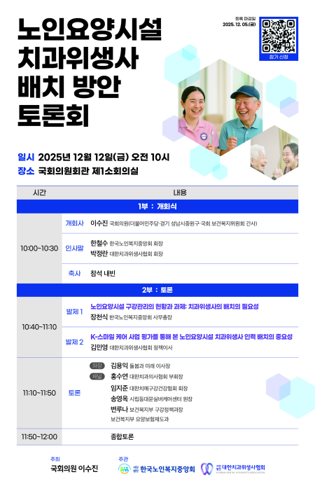 이번 토론회는 국회 보건복지위원회 간사인 이수진 더불어민주당 의원이 주최하고 한국노인복지중앙회와 대한치과위생사협회가 공동 주관한다. 국회의원회관 제1소회의실에서 열릴 예정이며, 보건복지부와 국민건강보험공단 관계자, 요양시설 운영자, 직능단체와 학계 등이 참석해 논의를 이어갈 계획이다.