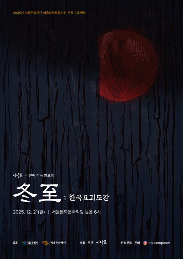 전통과 창작, 설화와 사운드 실험이 결합된 특별한 공연이 관객을 찾는다. 서울문화재단 예술창작활동지원에 선정된 작곡가 이아로의 두 번째 창작 발표회 ‘동지;한국요괴도감’이 오는 21일(일) 오후 6시, 서울돈화문국악당에서 열린다. 공연은 전석 무료로 진행되며, 티켓은 선착순 배포된다.