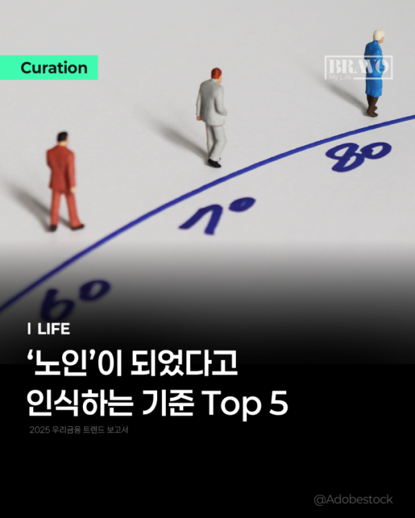 2025 우리금융 트렌드 보고서에 따르면 시니어들이 자신을 노인으로 인식하는 가장 큰 기준은 ‘나이’가 아니라 ‘건강 상태’였다. 신체적 건강이 눈에 띄게 악화되거나, 정신적·인지적 능력의 변화를 체감할 때 비로소 노인이 되었다고 느낀다는 응답이 가장 많았다. 이어 정년퇴직 등으로 수입 활동을 더 이상 하지 않게 되는 순간, 법적으로 노인으로 인정받는 시점, 주변에서 노인으로 대우받기 시작할 때가 뒤를 이었다. 이는 노후에 대한 인식이 단순한 연령 기준이 아니라 몸과 마음, 사회적 역할 변화와 깊게 연결돼 있음을 보여준다.