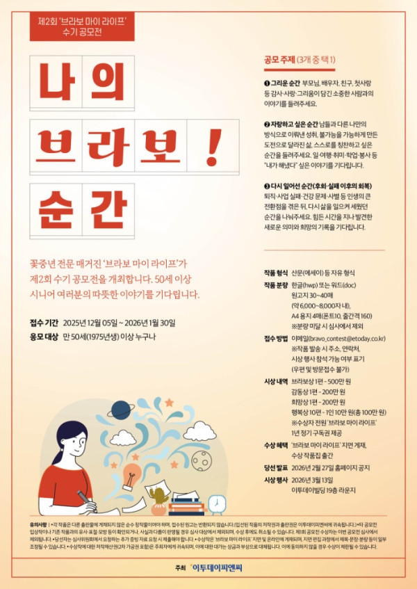 응모 기간은 2025년 12월 5일부터 2026년 1월 30일까지이며, 당선작은 2월 27일 브라보 마이 라이프 홈페이지를 통해 발표된다. 시상식은 3월 13일 서울 이투데이빌딩에서 열린다. 자세한 응모 방법과 일정은 브라보 마이 라이프 홈페이지 공지사항에서 확인할 수 있다.