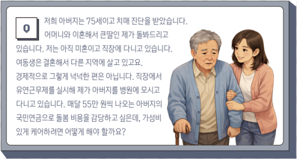 치매 케어의 큰 그림을 그릴 때는 네 가지를 고려해야 합니다. △치매로 아픈 분의 상태 △돌봄에 참여 가능한 사람 △돌봄이 필요한 시간 △돌봄 비용 등인데요. 이 기준을 적용해보면 아직 아버지는 큰 도움이 필요한 상태는 아니며, 큰딸이 돌보지만 타지에 사는 둘째 딸의 측면 지원도 가능할 것 같습니다. 딸이 직장에 다니는 낮에 돌봄이 필요하고, 매달 55만 원 이내의 비용을 지출할 수 있습니다.