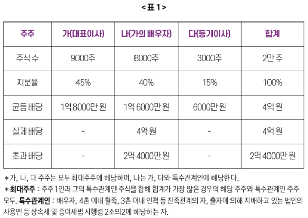 법인은 이익이 나면 원칙적으로 주식 수에 맞게 배당해야 한다. 그런데 최대주주가 자신의 배당금을 포기하거나 배당 비율을 조정해, 특정 주주가 지분보다 많은 배당을 받는 경우가 있다. 이런 경우를 ‘초과 배당’이라고 한다.