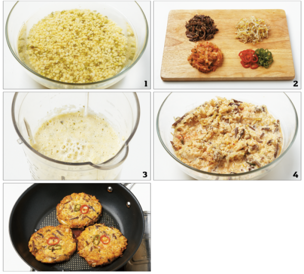 1. 녹두는 깨끗이 씻고 5시간 이상 불린 뒤 한 번 더 물에 비벼 씻어 준비한다.