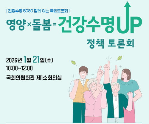 오는 21일 오전 10시, 국회의원회관 제1소회의실에서 ‘영양×돌봄=건강수명 UP 정책 토론회’가 개최된다. 이번 토론회는 대한민국의 평균수명(84.6세)과 건강수명(69.3세) 간의 간극이 벌어지는 현실 속에서, 영양불량과 만성질환 악화 등으로 발생하는 노쇠를 막기 위한 실질적 대안을 마련하기 위해 기획됐다.