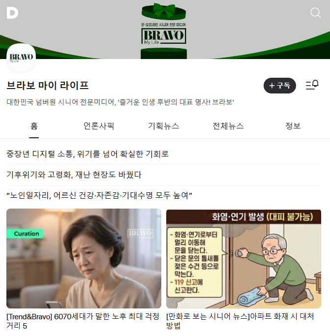 앞으로 다음(Daum)을 통해 브라보의 기사들이 송고되며, 더 많은 독자에게 시니어 전문 콘텐츠를 전할 수 있게 됐습니다.